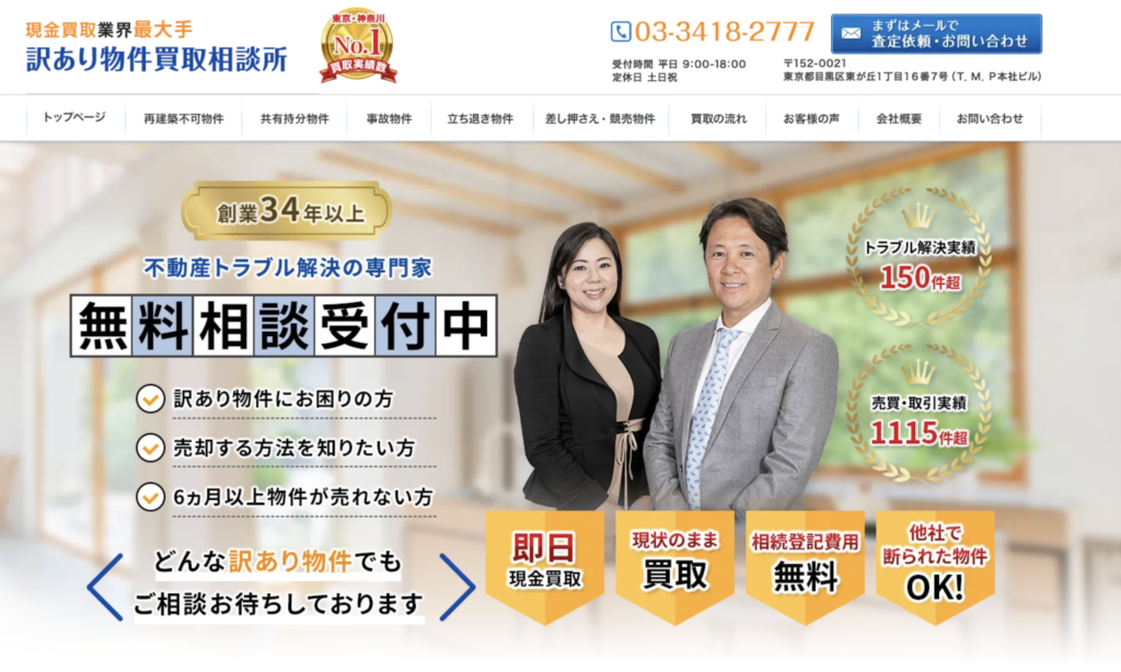 株式会社ティー・エム・プランニングは東京都目黒区に本店を置き、1991年創業の老舗不動産会社です。創業以来34年以上にわたって訳あり物件買取に従事しており、民法や民事訴訟法の知識を持つスタッフが対応する点に特徴があります。